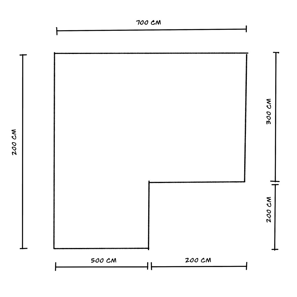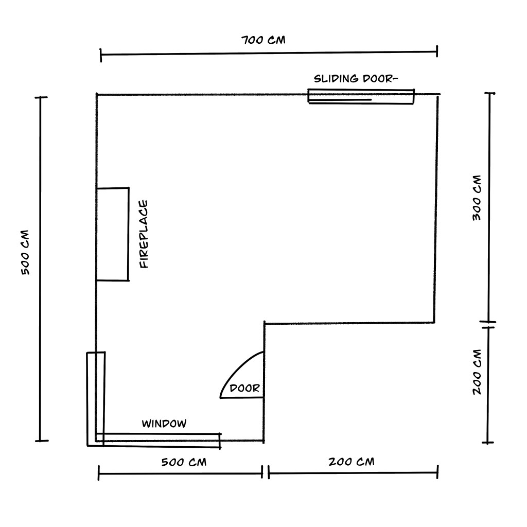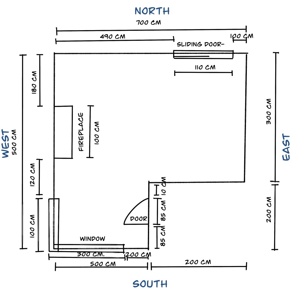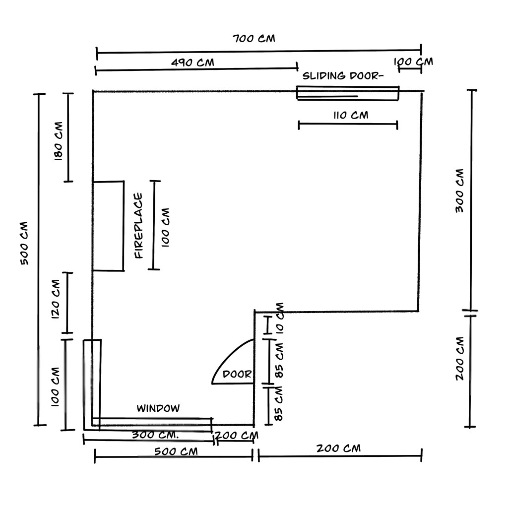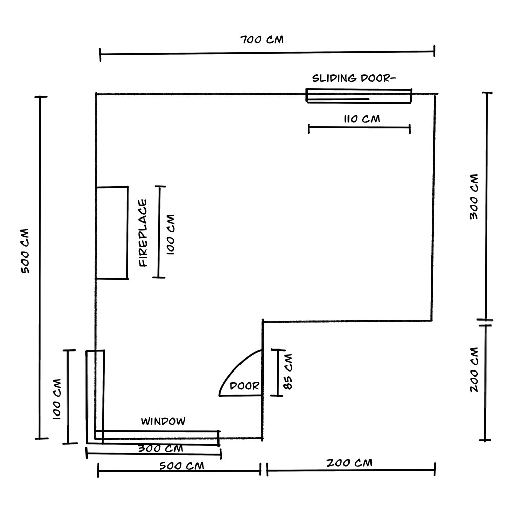 Take measurements of the full length of each indoor wall (in cm) and write them down on your plan.